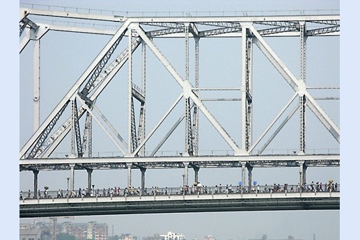 Howrah Bridge.Questa incredibile opera d'alta ingegneria assomiglia al Sydney Harbour Bridge, ed essendo percorso da qualcosa come 100.000 veicoli al giorno è probabilmente il ponte più trafficato al mondo. Il ponte si innalza sul fiume Hooghly con un'unica campata di 450 m. ma è tassativamente proibito fotografarlo (io l'ho immortalato dal traghetto Armenian- Stazione ferroviaria di Howrah). Di solito il traghetto è il mezzo più veloce per attraversare il fiume tenuto conto del traffico che congestiona il ponte. Un nuovo ponte è stato costruito più a valle, proprio per migliorare la circolazione sull'Howrah Bridge, ma trattandosi di un ponte a pagamento il problema non è stato risolto. |